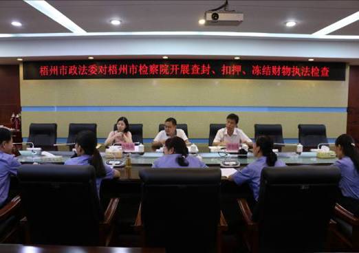 7月28日下午,梧州市委政法委执法督查组一行来市检察院开展关查封、扣押、冻结财物执法检查活动。该活动以听取汇报与现场抽查的形式进行。查封、扣押、冻结财物执法检查